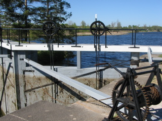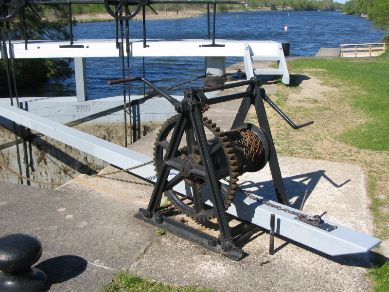 | This is the winch that opens the water gate in the downstream gate. It is used to let the water out when locking down. The up stream gates are arranged to channel the water through a U shaped passage built into the lock wall. This lets the water rise up from the bottom of the lock, keeping the turbulance down and making it eaiser to hold the boat in place. |