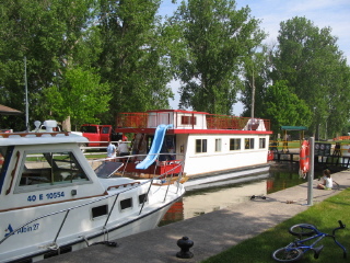 | In lock 20 I met up with this rental house boat. Its a simple pontoon boat with a big box on top, probably just like a camper. In fact I was told the early rental companies just took pontoon boats and mounted pick-up truck campers on them. Probably not the most sea-worty craft on the canal, but workable. The people aboard seemed to be having a good time | |