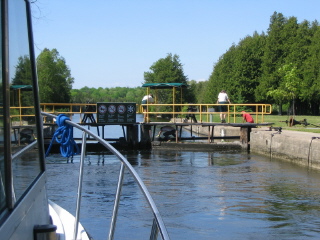 Bad news at lock 22- a cable failure on the upper gate opening mechanism, and the repair truck was on the way. So I sat in the shade and read the books I bought about the locks, while hearing the band and a bagpipe playing for the graduation ceremony at Trent. Not an unpleasant couple hours. Eventually the repair truck arrived and closed the gate with its boom so a big boat could get down. Then they let me up, while the repair guy was downunder the walkway of the gate attaching the new cable. I have often used only one gate, so it was easy for me. |