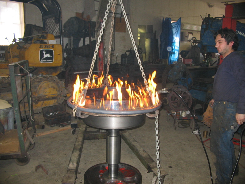 Here the tire is being heated with a propane ring burner. We only need to get it up to about 300 degrees F. This photo was shot just as the burner was lit. As the air flow was adjusted the flames came down to a nice, hot, blue flame, but that doesn't make a very exciting photo.