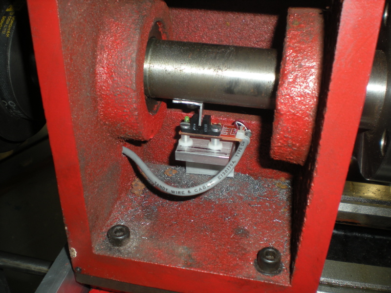 Instead of a wheel with a hole I made a simple piece of aluminum angle to act as a shutter. I tapped a small hole into the spindle and screwed the angle on. Obviously this kind of tab would never work outside the headstock- it would grab every chip and wire on the machine.