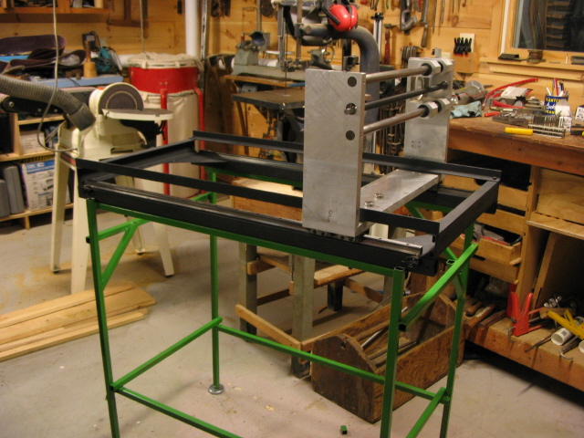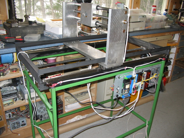 I started collecting parts to make this router several years ago. I found a set of 36" long linear ball slides and several servo motors at the MIT radio club flea market. The most usefull part of this router was a piece I found in an electronics surplus store. It was an aluminum slab about 16x22" and 3/4" thick. It had 2 pairs of round linear bearings and rods arranged in an XY fashion, carrying a platform that held a microscope. I assume it was used to read some kind of photo or chart. I bought the whole thing, including the microscope, for $20. I wish I had taken a photo of it, but the gantry Y carriage is the basic moving part of the original device.