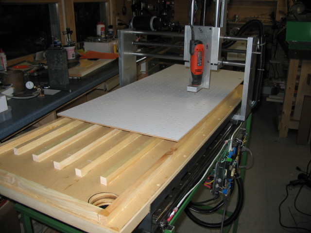 | I made a vaccuum table to hold thin wood sheets. The 3/4" strips make air channels and support a piece of peg board as the top. The pegboard is held down with a few wood screws and can be changed in a few minutes when it gets to scarred.In this photo the pegboard is slid back to expose the strips. | |