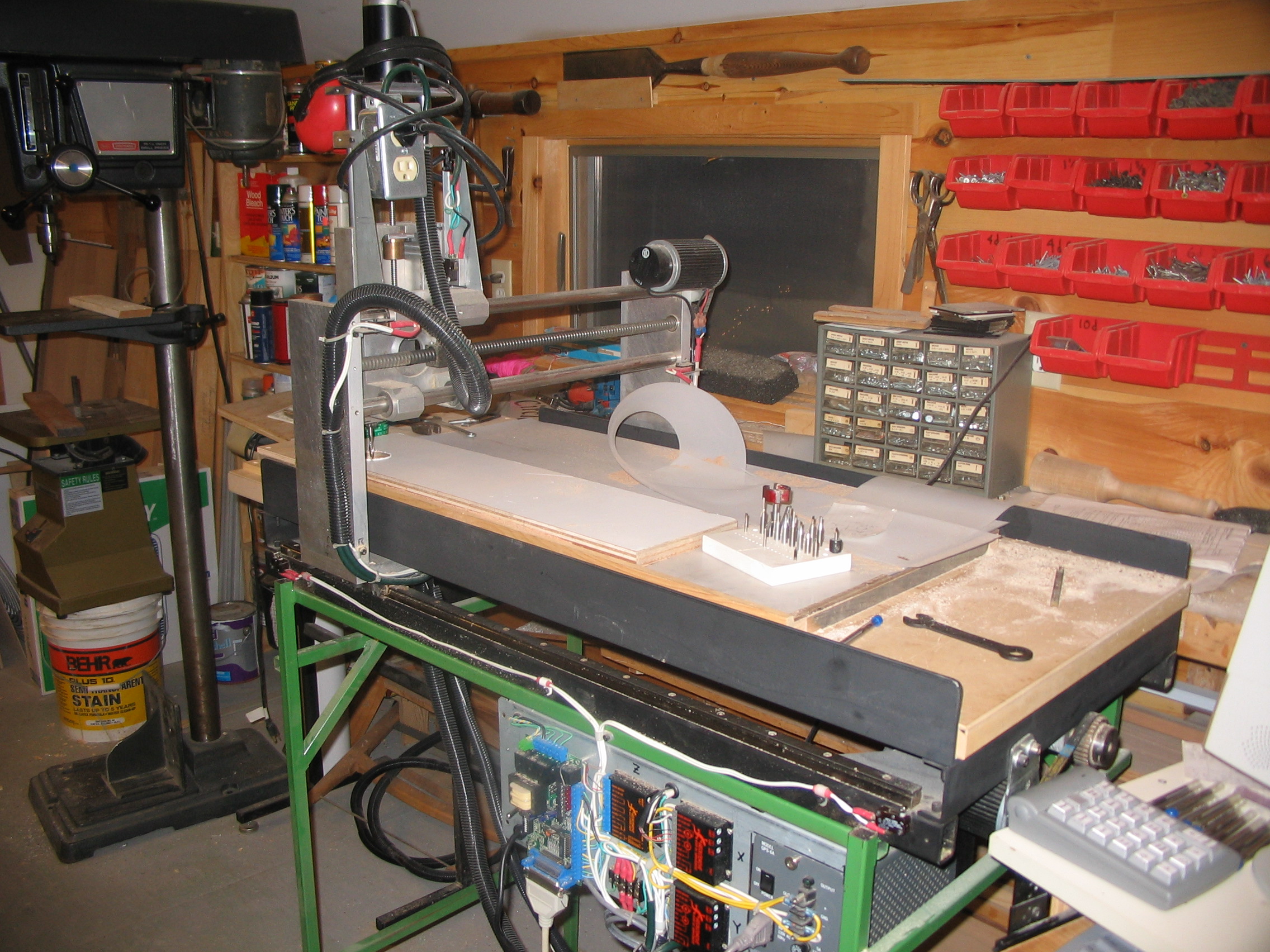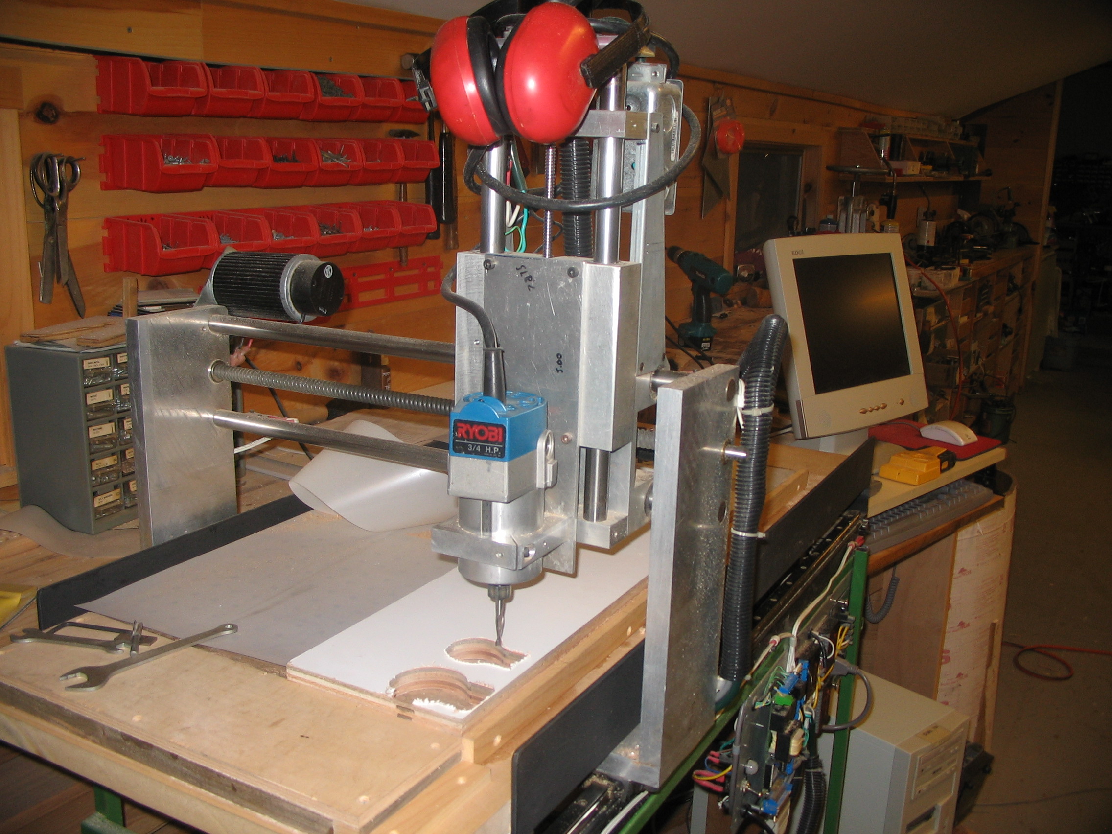 I also used cheap router bits for a while, and found they left a ragged cut. I recently bought some good, American made, solid carbide bits and get much cleaner cuts. The vacuum hold down, powered by my shop vac works well but is really noisy. Someday I hope to find a cheap vacuum pump and try that. My servo motors are also very noisy when at a stop. These were used motors from the flea market and I really dont have any specs on them. They do seem to have enough torque, but the encoders ae very high count and that limits my max speed of travel. I bought some new motors, but because I did such a nice job of all the cabling I cant bring myself to hack out all the wires and replace the motors. Someday the noise will get to me and I'll make the change, but otherwise this machine works well, and I expect to just use it to make parts. |
