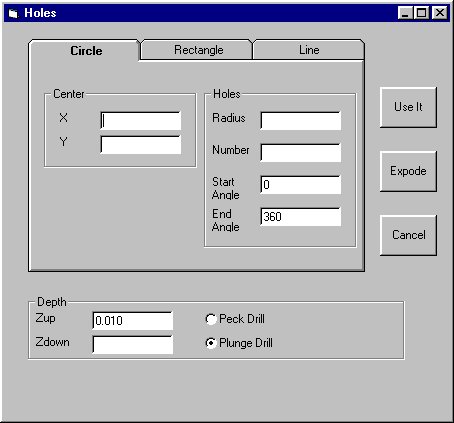 To add features to the program you select a button on the top of the main screen, then an appropriate form opens to build that object. Following is the screen for a line, rectangle and an array of holes. Each of these is a simple 'fill-in the blanks' operation. Note that the program assumes a starting point, based on the last point entered, but that can eaisly be replaced.