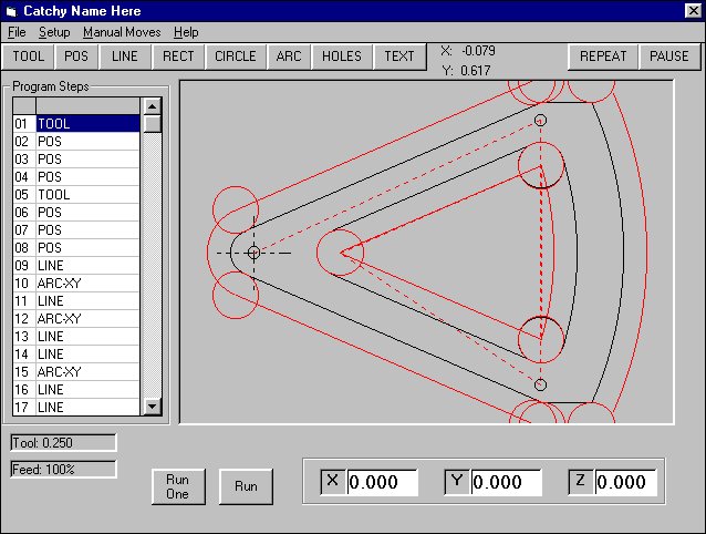 The form should be fairly obvious- the area to the left shows the individual steps in this program, the image area shows the part outline in black, and the tool path in red. The red circles indicate where the tool will start and stop various paths. The row of buttons across the top select various objects to add to the program.