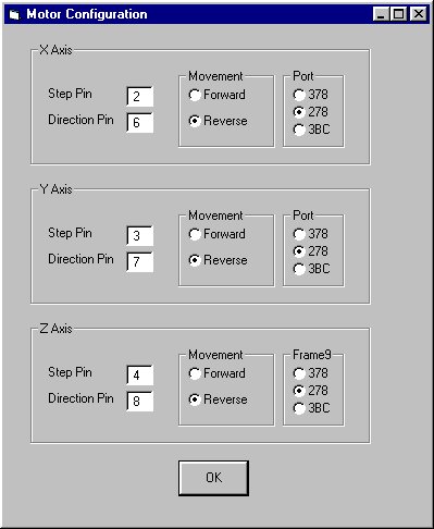 Before you can use this system you need to configure the motor control. CNH uses a simple setup screen to select the parallel port pins for each function.