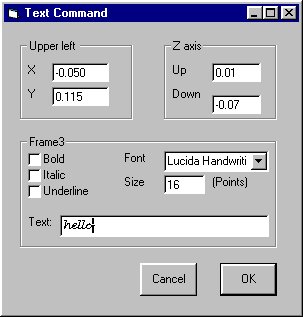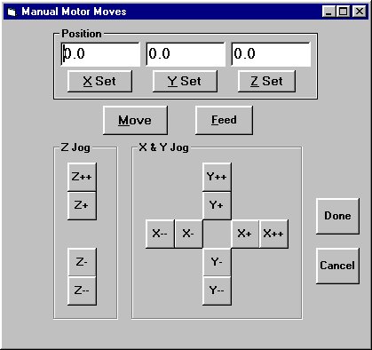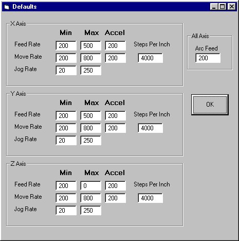 I started this work in 1998 or so, and in early 2002 I started to work on a new and improved version. My work has all been around the interface, or GUI part of the problem. I do not want to get into the real time pulse generation problem. I need either a 'black box' of hardware or an interface to some software. I have tried to use MACH2 and DeskCNC but have had trouble with each.