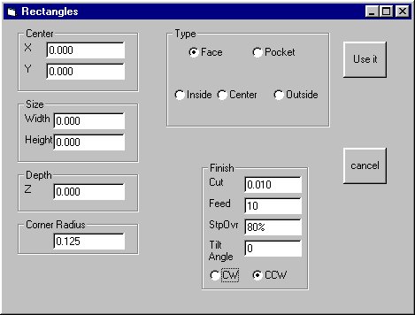 A frined of mine, Roland Gaucher, bought a commercial miling machine and CNC system from AcuRite, with software called MillPower. I learned to use his software in just a few hours, and really liked it, so I decided to try to write something like it. This is not an exact copy, but I did folow their basic concept of use.