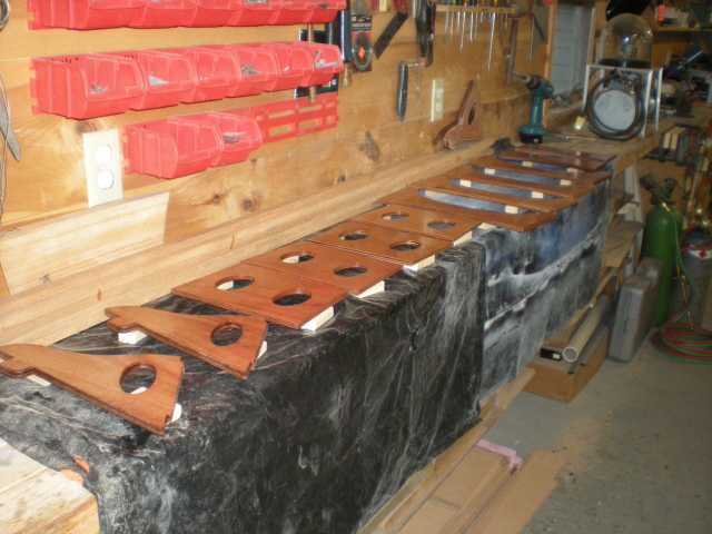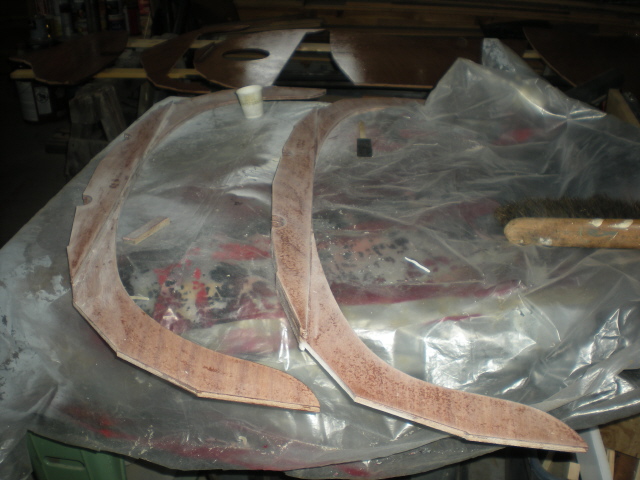And then laid out and epoxy coated. Every surface of every part gets 2 coats of epoxy, so I decided to do all the parts before they were placed into the boat. That way I could sand them all after coating while they were still flat parts. The epoxy does not want to flow out smoothly, so a good bit of sanding is needed.