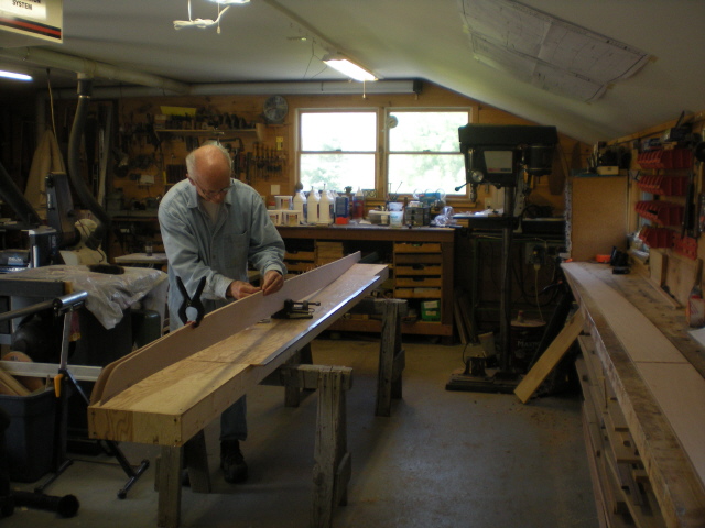 One of the first operations is to scarf the planks. The planks are supplied in 2 halves, with a fully formed scarf joint. You simply lay the planks on a bench, align them, check the amount of bow against the drawing and glue them together with epoxy. My bench was only wide enough to glue one plank at a time, there are 6 planks, and the glue requires 24 hours to cure.