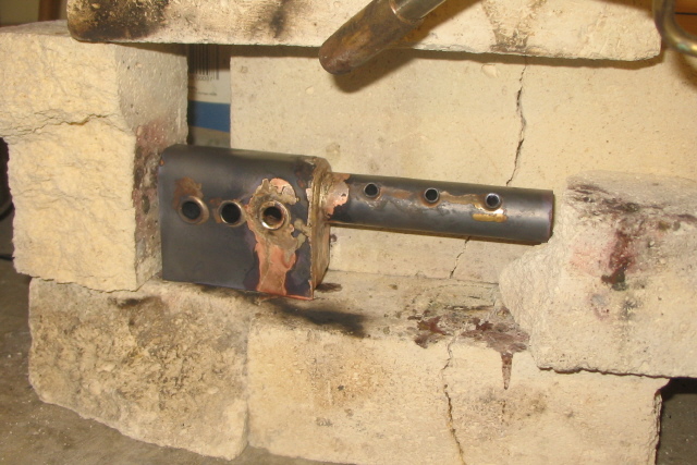 | Here is the flue tube and firebox after their soldering operations. Notice I've already built the steel shell for the simple boiler, which will also be scrapped. |