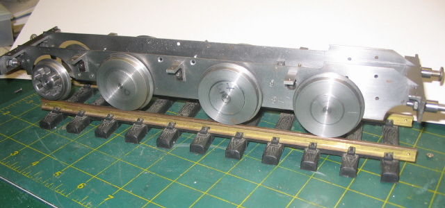 | This photo shows the frame assembled with the end beams and wheels and axles. Note that the driver wheels are simple steel discs, I plan to replace these with cast iron spoked wheels, but I wanted to get the model up on some wheels quickly so I could see what it was going to look like. |
