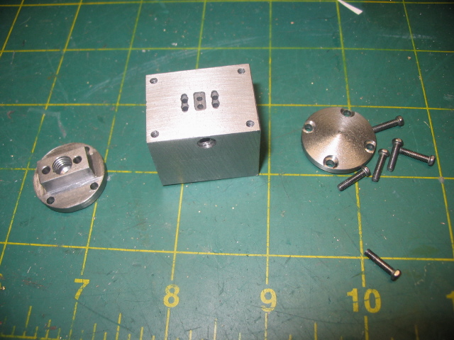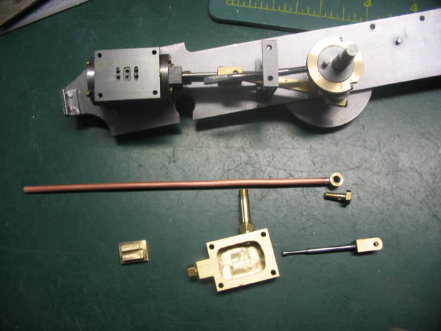 | Here are the valve parts- the chest, spindle and the actual valve. Also shown os a banjo fitting and copper pipe that will supply the lubricator oil to the engine, directly into the valve chest. |