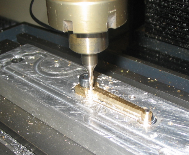 | Here the connecting rod is being profile milled on the Prazi CNC. Note the aluminum sacrafice plate under it shows the outline of the side frames, and even some of the spoke patterns- the same block has been used for all these operations. When it gets to uneven Ill flycut it flat and use it more. |