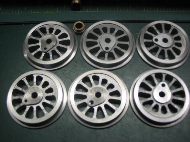 | 6 drivers ready to install. These were machinbed from a solid bar of cast iron, then the spokes were cut on my Prazi CNC mill . It took 29 minutes to cut each wheel with a 1/8" end mill. I cut the pockets between spokes in passes just .031" deep. |