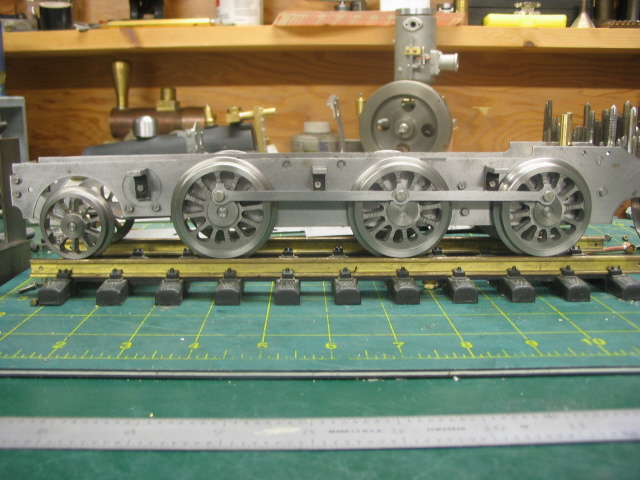 | Here is the frame on the new wheels, with the side rods in place. The side rods were also