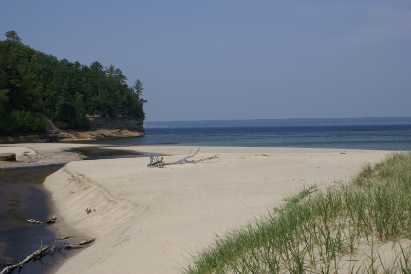 The beach at the mouth of the Miner's River between the cliffs of Picture Rocks. The river carried wonderful stones to it's mouth onto the beach. Bonnie Hiked from the top of the cliffs down to the beach where she spent an hour joufully collecting stone filling herpockets. The water as it enters the lake is deep, swift and cold but the lake is colder.