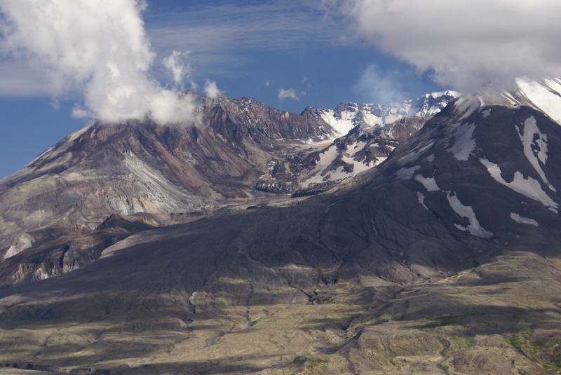 This is from the top visitor center, looking right into the side of the crater. You can see the new dome from the continuing erruptions that started in 2004. This erruption is very slow, just a few cubic feet per second, but it grows noticeably from day to day. Note the steam rising, on the right edge of the dome. It looks like part of the clouds, but it is steam. The rising lava dome has forced the glacier to spread apart, with two distinct flows now moving around the lava. They are likely to re-join and surround the lava dome.