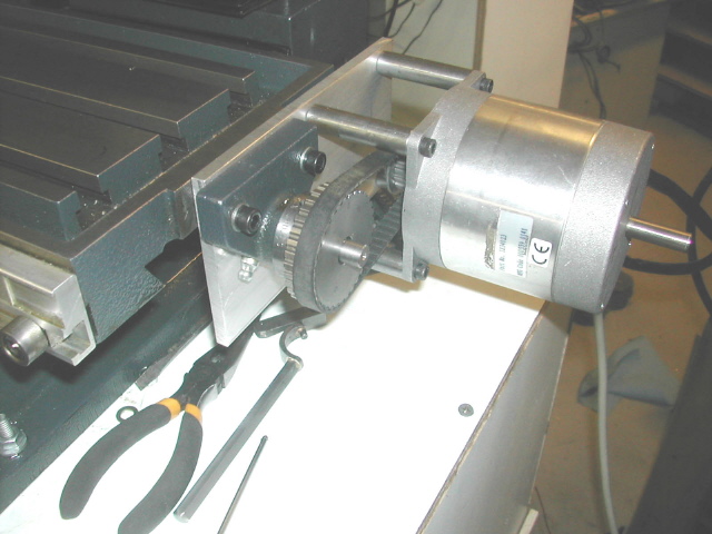 I decided to mount the motors using a 2:1 pulley ratio with toothed drive belts. Each lead screw has nice ball thrust bearings installed. There is a solid collar pinned to the screw that held the calibrated dials. Since I wouldn't need these I removed them and placed the pulleys in their place. This required boring out the pulleys to fit the lead screw shaft and drilling a cross pin hole in the pulley. The threaded bearing pre-load nuts were unaffected by this. Its also a simple one to reverse if I ever decided to return the machine to manual use, as I made no changes to the lead screws.