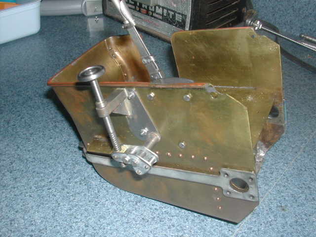 This is a photo of the tender as I removed it to start painting. Note the brass sides were hammer formed over a hardwood block. The mechanism shown is to operate the brake band.