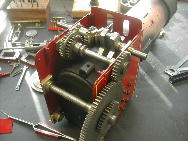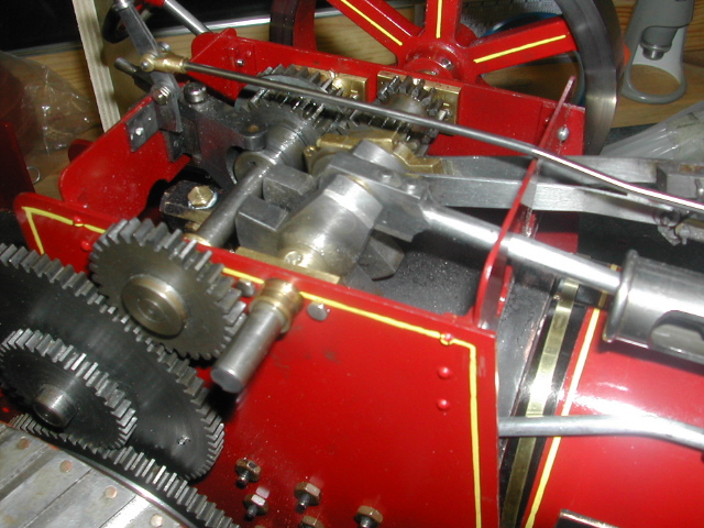 Here is a good view of the main motion work. The horn plates have been painted and the re-assembly is underway. Note that I cut all the gears from cast iron bar stock.