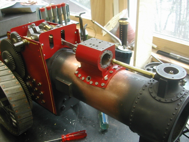 The cylinder block has been painted and mounted on the boiler. I decided to paint the boiler red after I bought a red new pickup truck. I bought touchup paint to match my 2003 Chevy- Victory Red!