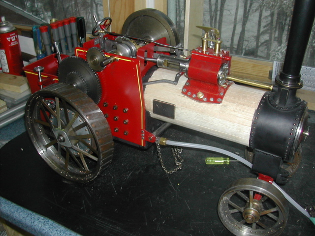 Next the engine is all assembled. Note the air hose connected to the blow down valve. The engine has been run on compressed air. Note also the wood lagging fitted to the boiler. I used super glue to hold it in place while I was working it. Once it was all in place I wrapped it with a fiber tape, then installed the brass cladding.