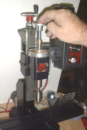 The first photo shows my driling attachment in use. Note the top is a simple disk with a bearing in it. To drill a hole you just press down on the disk, feeding the drill against a small spring. When released the spring pulls the drill back up.