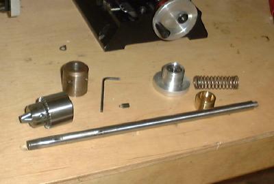 To set up for driling, simply screw the mill holder onto the spindle nose, put the spring and bushing on the rod, and drop it down the spindle hole. Align the slot with the mill screw and insert the set screw, being sure it rides in the slott and does not lock the rod from moving. Finaly, screw on the chuck.
